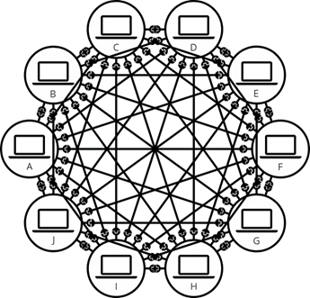 Figure 2 – Connexion de 10 ordinateurs entre eux = 45 câbles réseau requis!