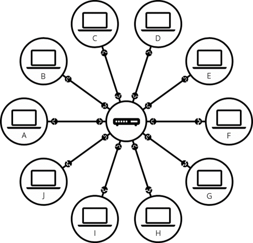Toutefois, lorsque l’on veut connecter plusieurs ordinateurs ensemble, on ne peut pas connecter un câble réseau partant de chaque ordinateur vers tous les autres. Même avec seulement 10 ordinateurs, cette solution créerait rapidement une quantité beaucoup trop grande de liens physiques à gérer. Imaginez tous les ordinateurs du monde entier!